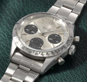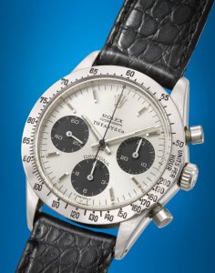 The second lot is a 1967 reference 6239 nicknamed “The Doctor,” carrying a $510,000 to $760,000 estimate. The steel Cosmograph displays a silvered dial with black subsidiary registers and an outer blue pulsations scale calibrated to 15 pulsations.